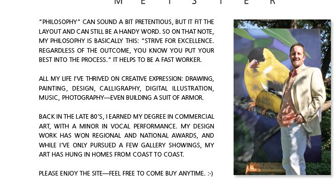 All material on the Designs by Meister web site (the "Site") including without limitation all informational text, photographs, graphics, audio, video, messages, files, documents, images or other materials (collectively, the "Materials"), whether publicly posted or privately transmitted, as well as all derivative works, is owned by Mike Meister ("DBM," "We" or "Us") or other parties that have licensed their material to DBM and is protected by copyright, trademark and other intellectual property laws. DBM disclaims any proprietary interest in trademarks, service marks, logos, slogans, domain names and trade names other than its own. Trademarks, logos, images and service marks displayed on the Site are the property of either DBM or other third parties. You agree not to display or use such marks without DBM’s prior written permission.